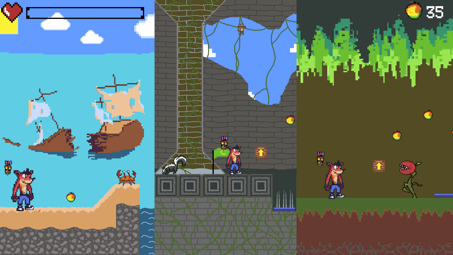 Ce projet a pour objectif de reproduire l’univers de la licence Crash Bandicoot vers un temps antérieur à celui de son premier jeu, sur PS2. Entièrement réalisé en Pixel Art, il se présente sous la forme d’un platformer 2D typé années 1980. Tous les designs ont été réalisés et animés à l’aide du logiciel Aseprite. Leur coloration s’effectue sur la base d’une palette de 32 couleurs :